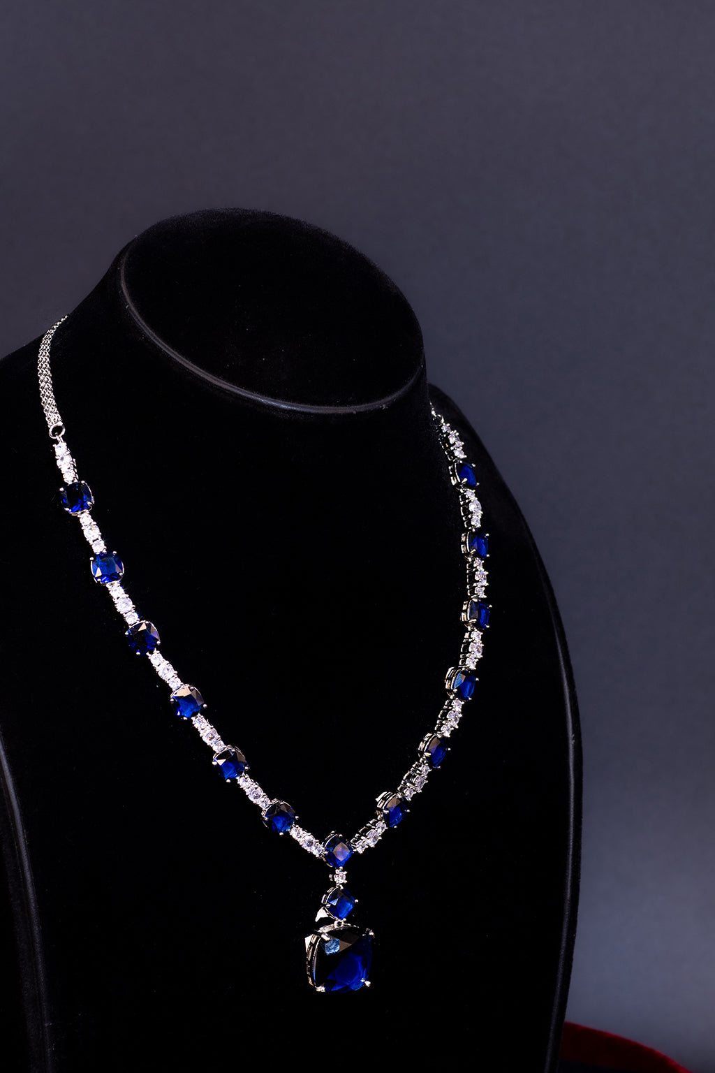 Our Blue Sapphire Necklace Set exudes sophistication and timeless beauty. This exquisite set features a stunning necklace adorned with deep blue sapphires, each gemstone carefully chosen for its rich color and brilliance. Accented with sparkling American Diamonds.