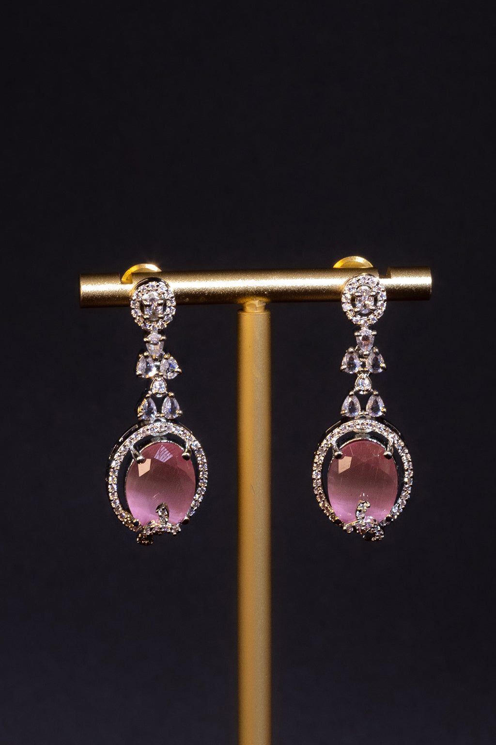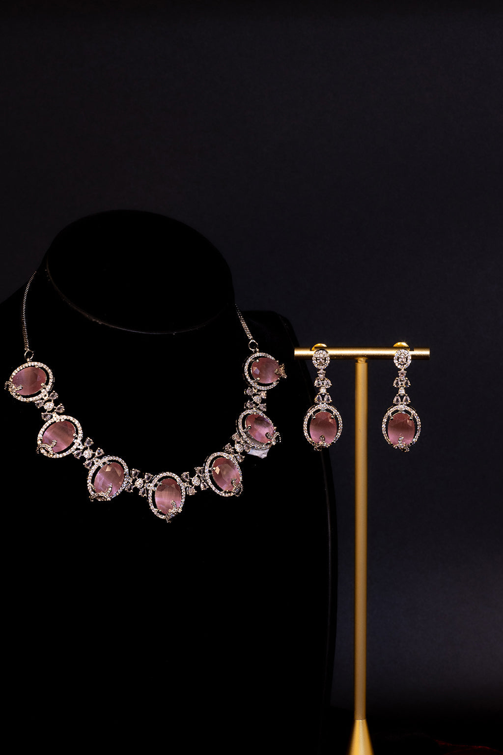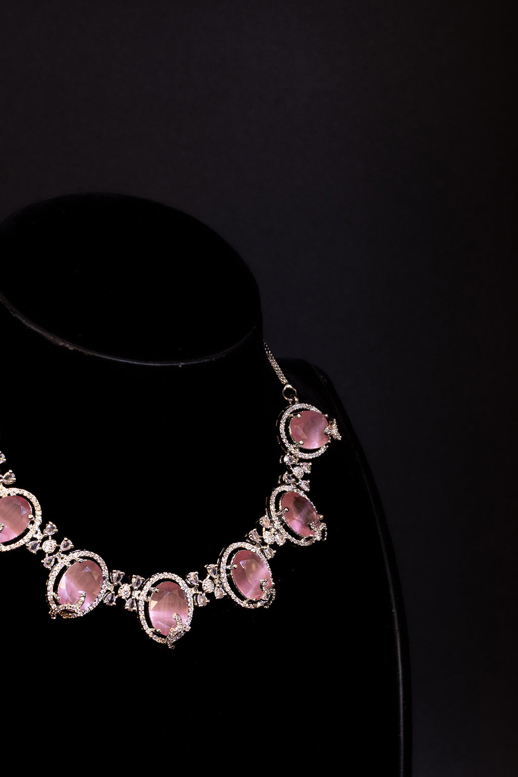Sparkling American diamonds and soft pink stones, creating a look of refined elegance. The carefully set diamonds enhance the subtle beauty of the pink stones, making this necklace a versatile accessory for both formal events and party wear.