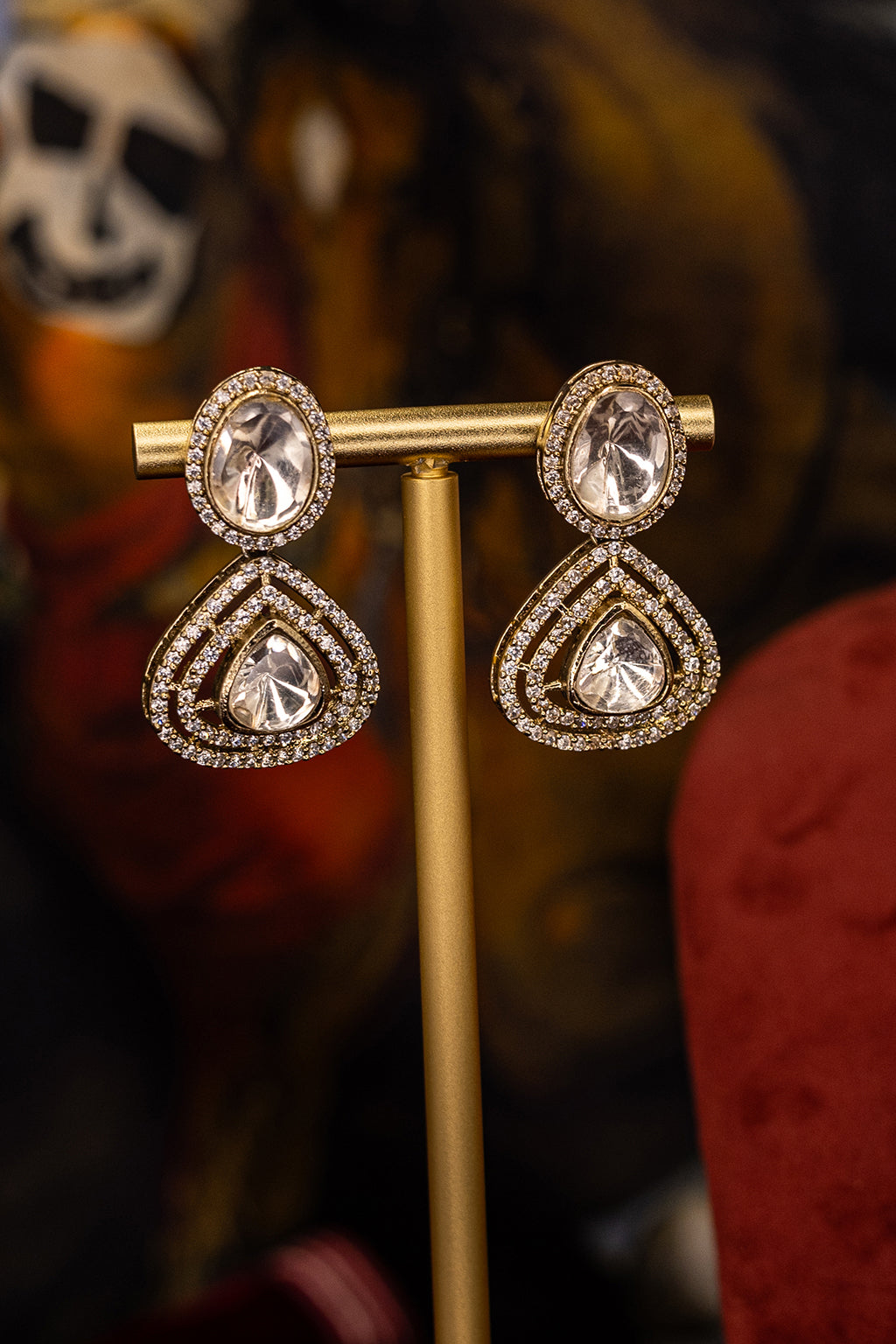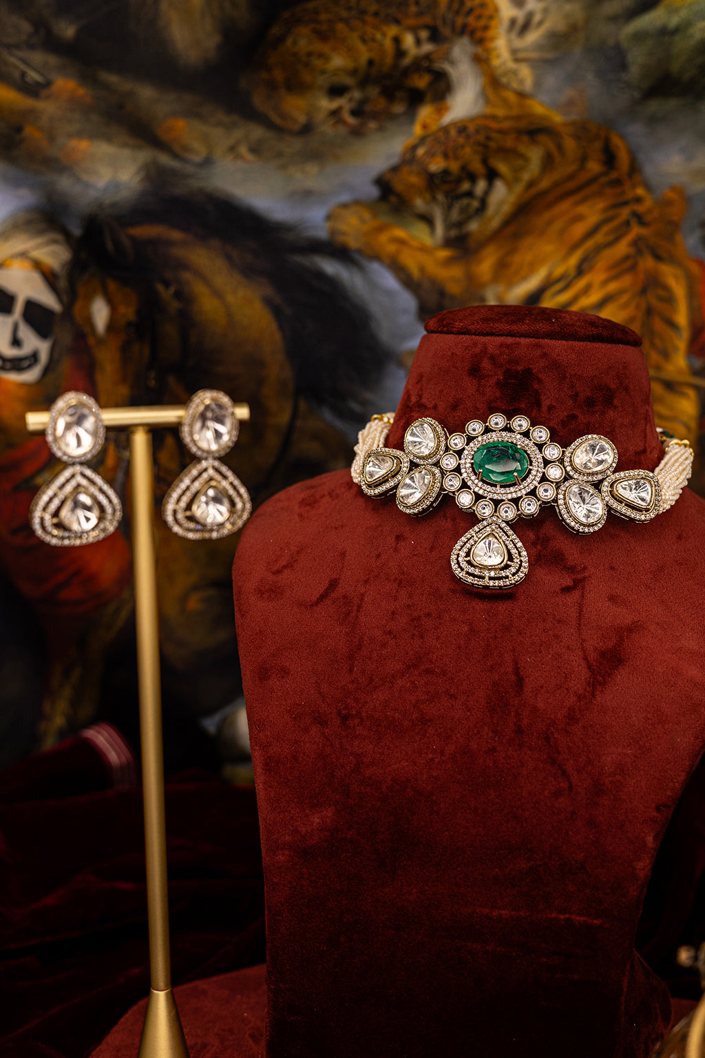 This stunning Polki Kundan choker set is a true statement of elegance and luxury. Featuring intricate Polki and Kundan stones, complemented by a beautiful layered white pearl chain.