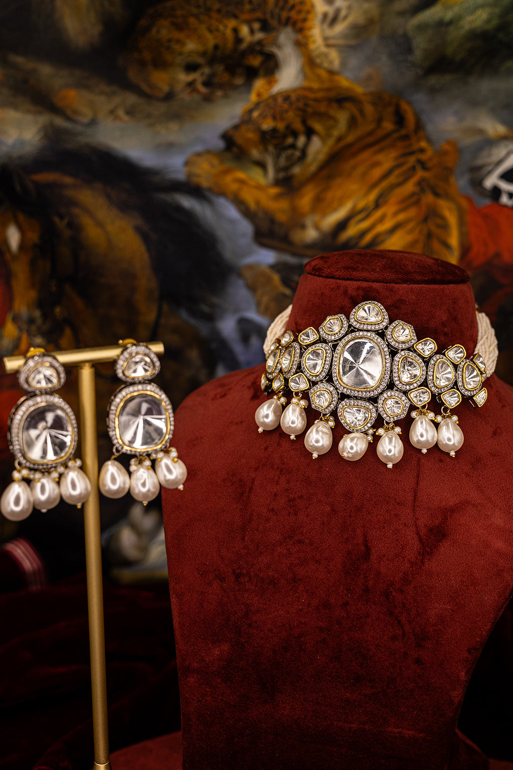 The combination of uncut Polki diamonds and radiant pearls creates a timeless, regal look that’s ideal for weddings, festivals, or special occasions. Whether worn with a classic saree or modern attire, this choker set will elevate your style with its sophisticated appeal and unmatched craftsmanship.