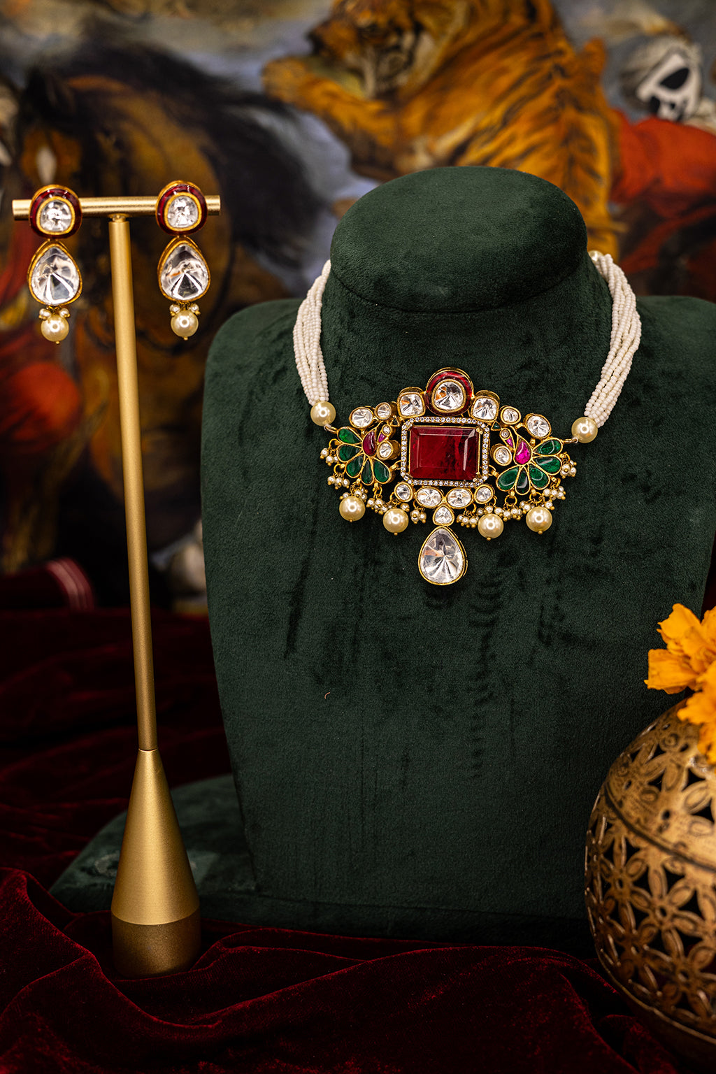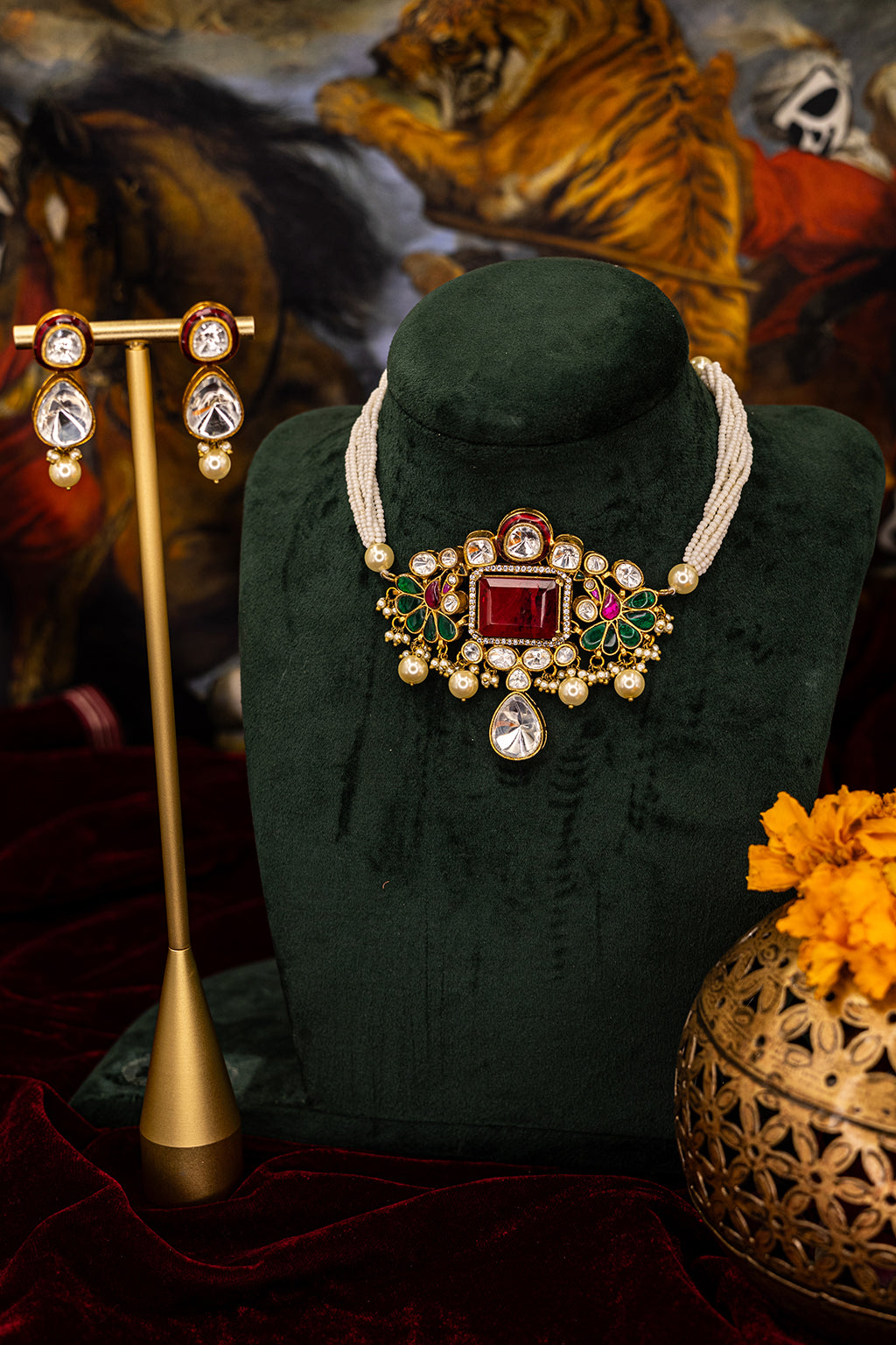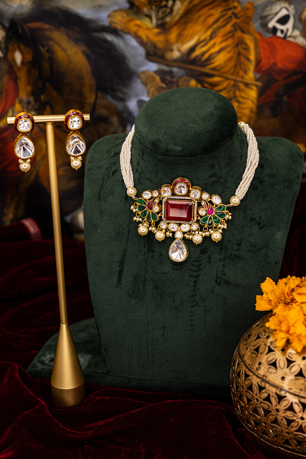 This exquisite Meenakari choker showcases the beauty of traditional craftsmanship, featuring intricate enamel work complemented by a bold red stud at the center.