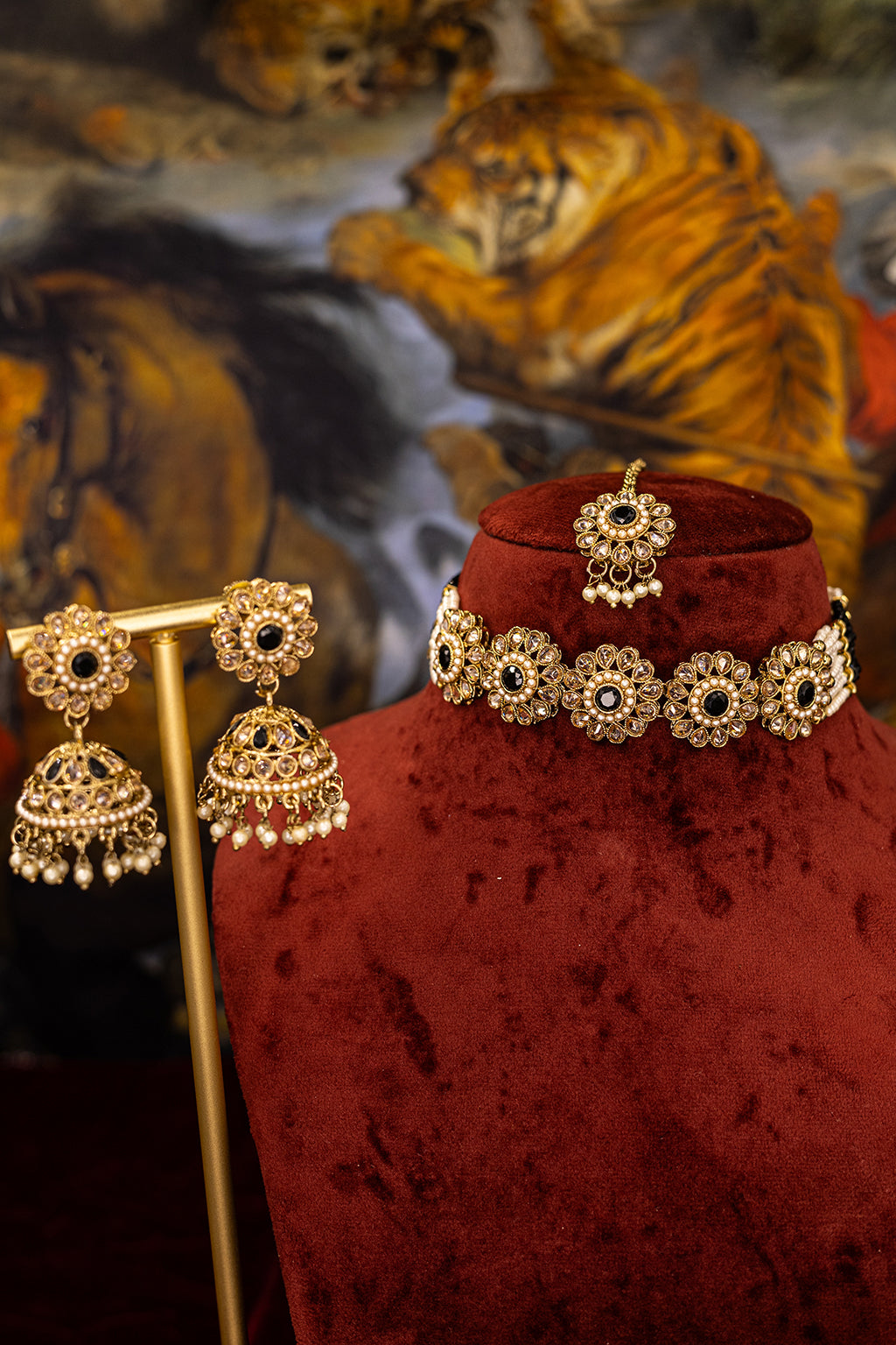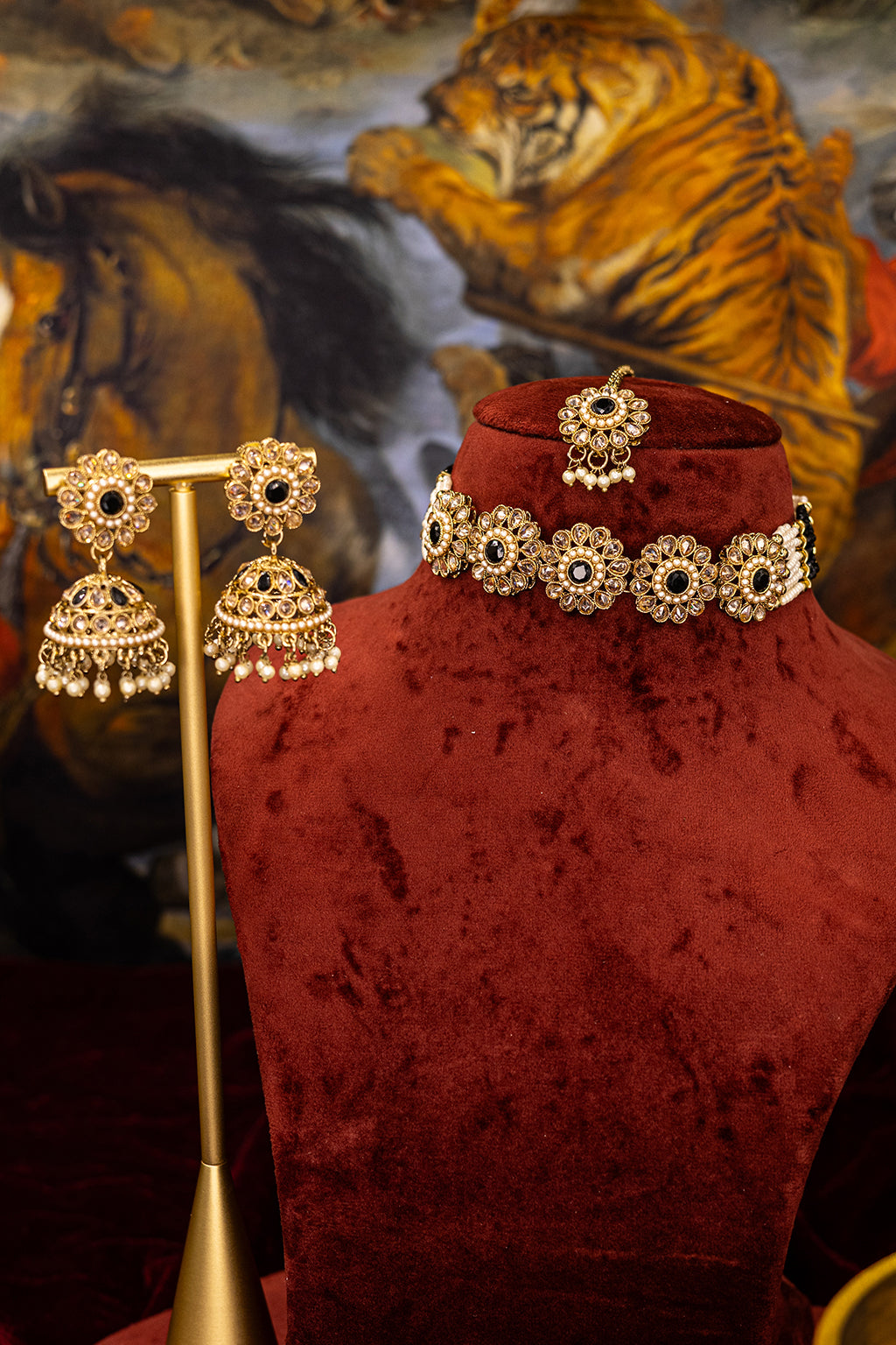 This stunning classic Kundan jewellery set includes an elegant choker adorned with intricate Kundan stones, complemented by matching jhumki earrings and a traditional tikka. The choker showcases timeless craftsmanship, while the jhumki earrings add a graceful, vintage touch.
