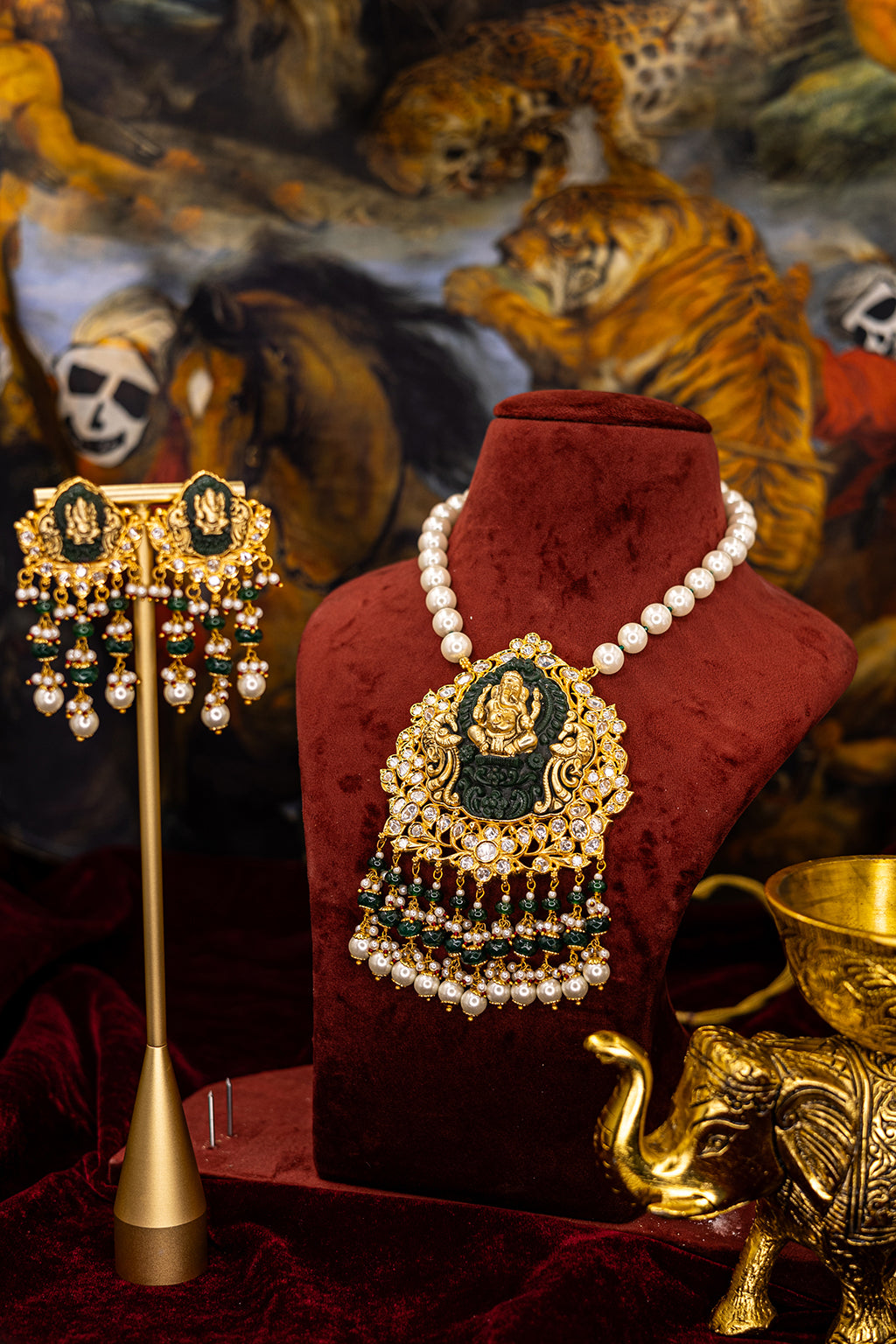Embrace timeless elegance with this classic long temple jewelry set, featuring an intricately crafted Ganesh idol pendant as the centerpiece. Inspired by traditional South Indian temple jewelry, this set is adorned with detailed motifs, antique gold plating, and vibrant gemstones, embodying a sense of divine grace and cultural heritage.