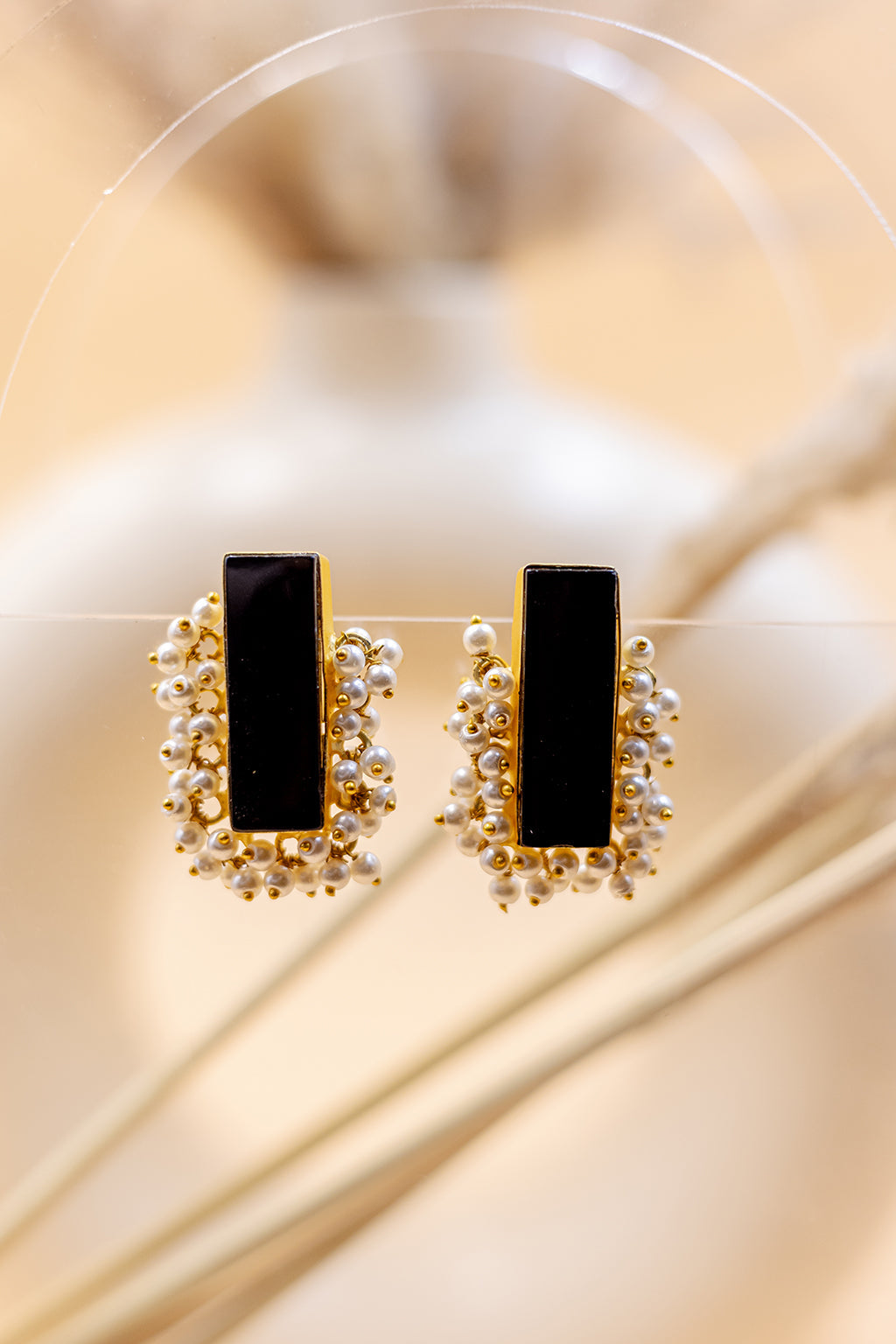 These striking black metal earrings with pearl detailing combine edgy sophistication with timeless charm. The bold black metal contrasts beautifully with the soft, lustrous pearls, creating a unique and versatile accessory. Perfect for evening events or elevating everyday style.