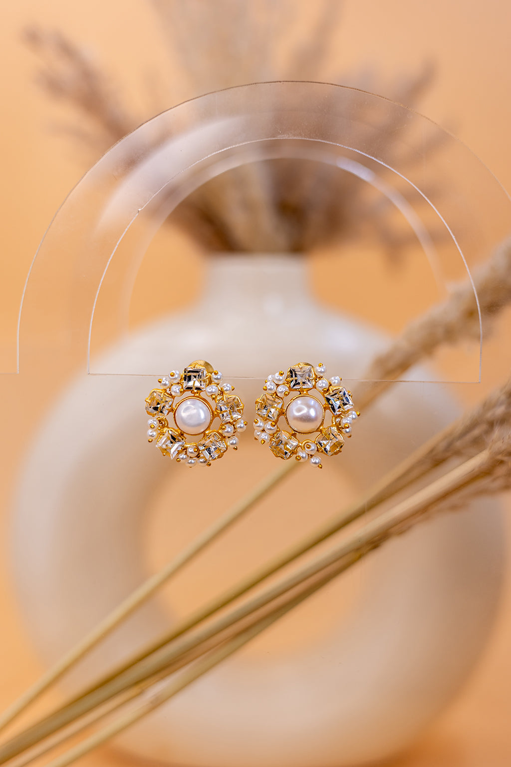 These stunning pearl stud earrings feature delicate pearls paired with sparkling AD stones, creating a luxurious and elegant look.