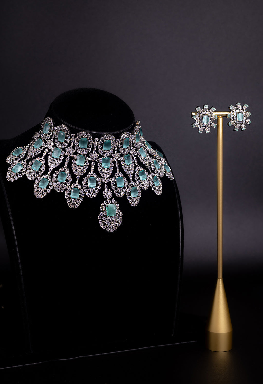 This Kiara-inspired Mint Green AD jewelry set features exquisite stud earrings and a matching tikka, designed to elevate your look with regal charm. The stunning stones and intricate detailing make it the perfect choice for weddings, parties, or special occasions. With its elegant and traditional appeal, this set adds a luxurious touch to your ensemble, ensuring you stand out in style.