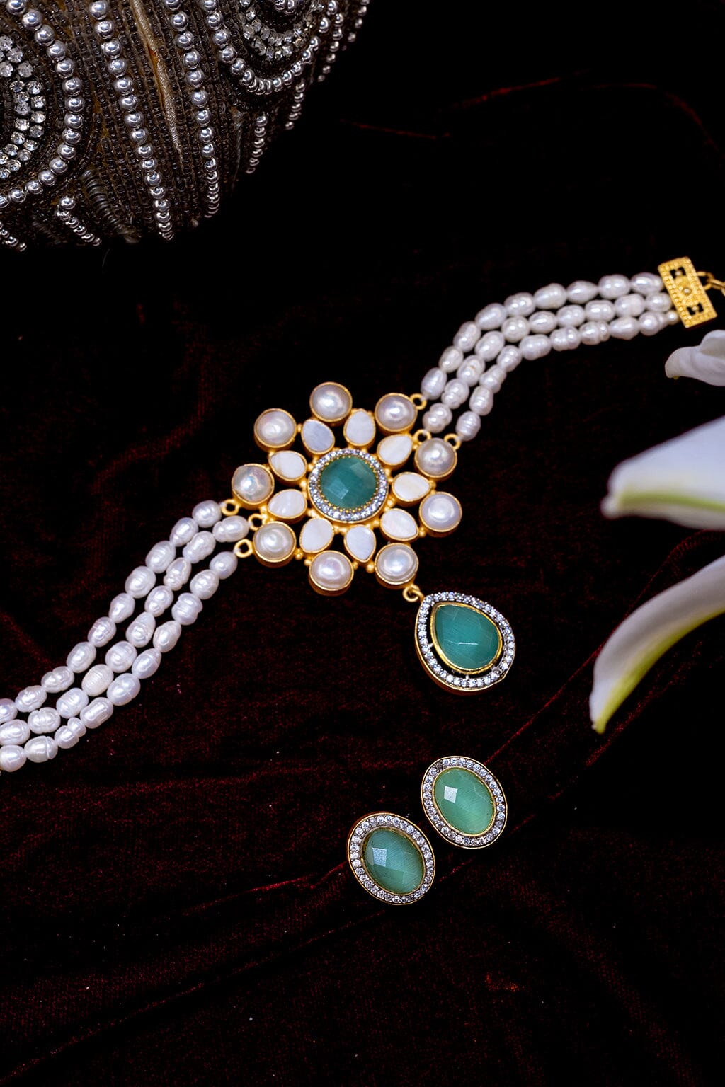 This stunning choker features real pearls paired with refreshing mint green studs, creating a perfect balance of elegance and color.