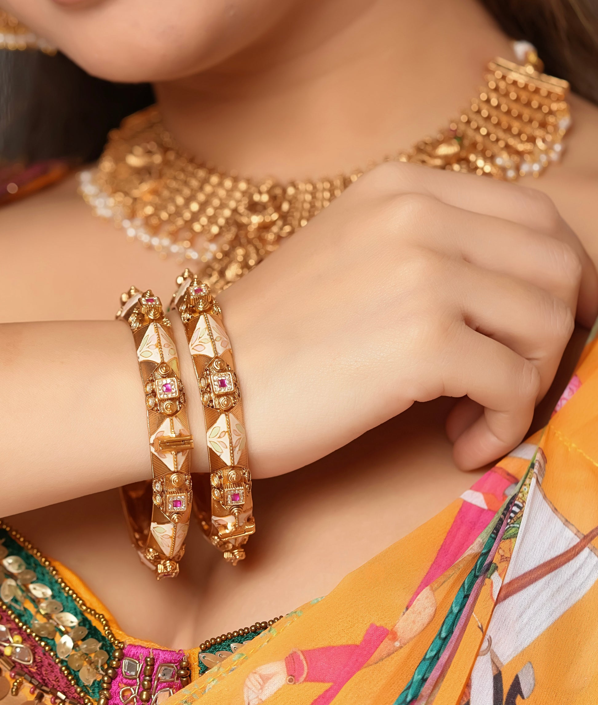 A striking blend of tradition and modernity, this cone-shaped bangle set features an illusionary design with detailed stone work. The perfect fusion of contemporary style and classic craftsmanship, ideal for any occasion.