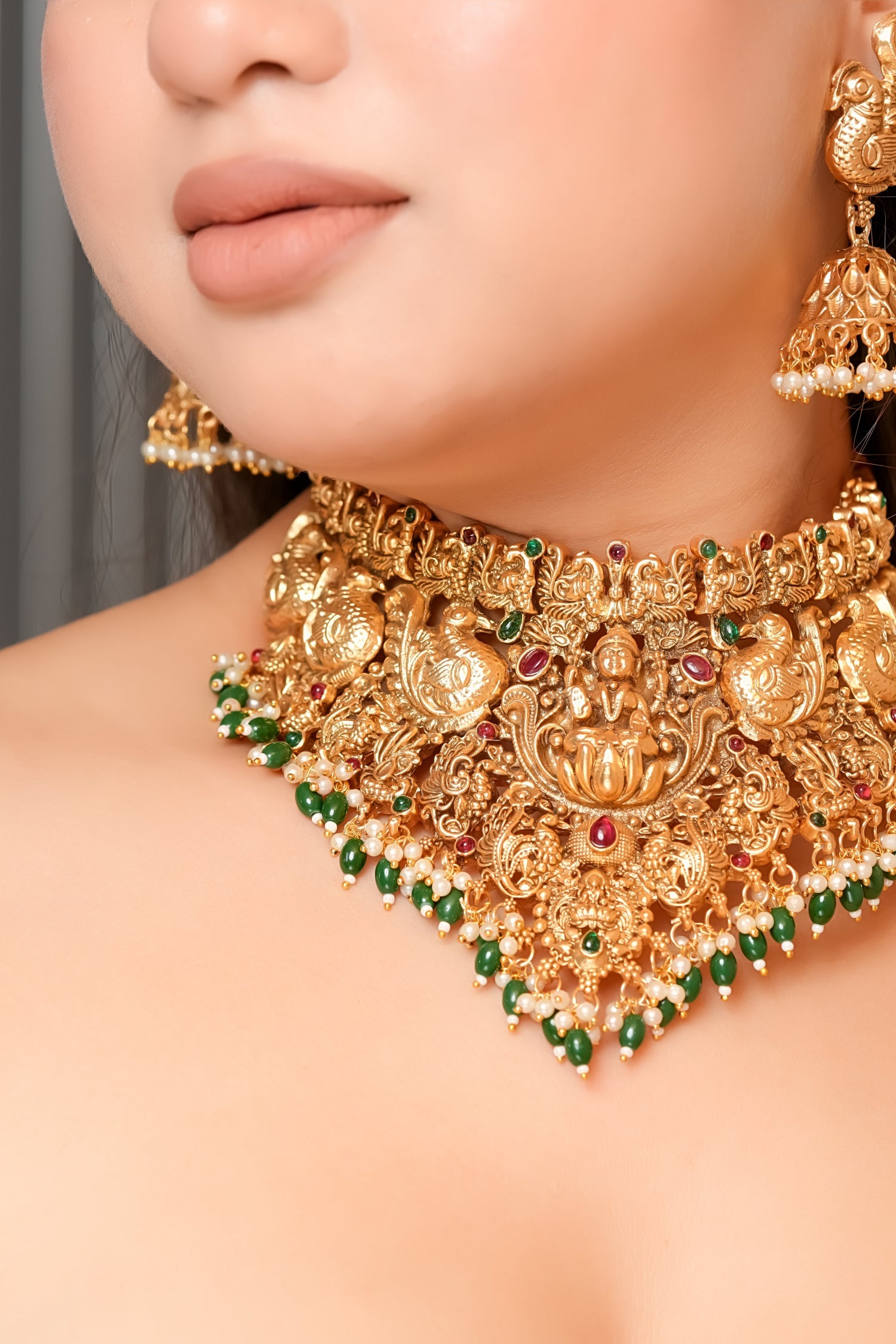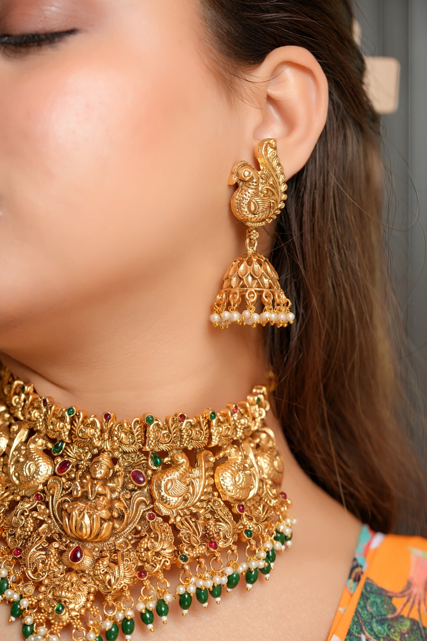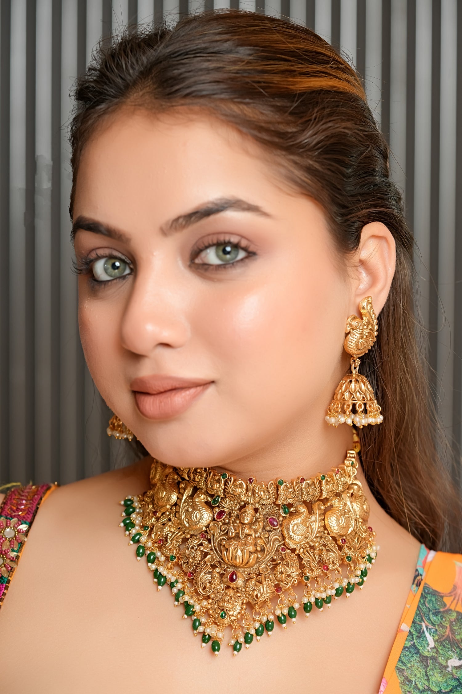 Immerse yourself in the beauty of cultural elegance with this intricately designed temple necklace set. Featuring antique gold details and deity-inspired motifs, it is perfect for weddings, religious functions, and festive occasions.