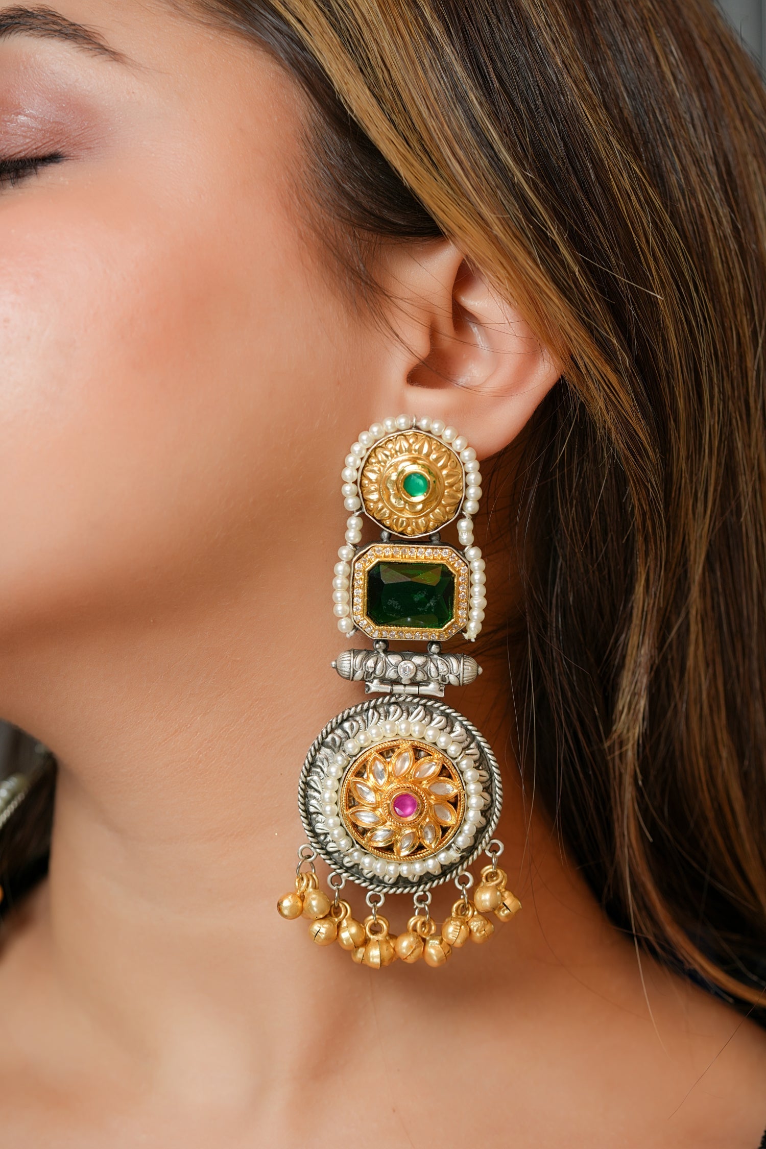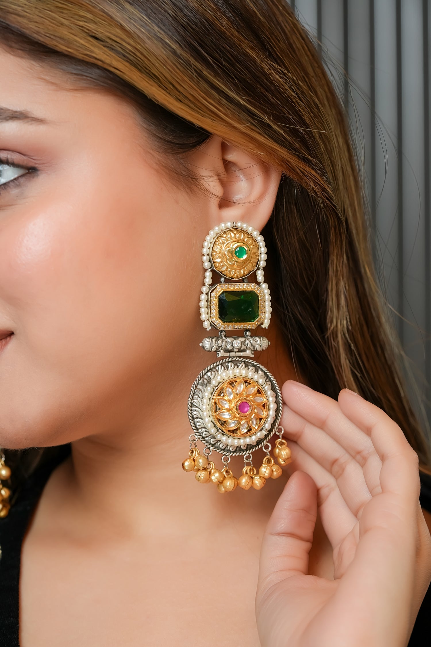 Make a statement with our Bold and Beautiful: Heritage-Inspired Long Jhumkis. Designed to showcase the rich traditions of Indian craftsmanship, these earrings feature intricate heritage patterns and meenakari accents, creating a stunning contrast between bold design and timeless elegance.